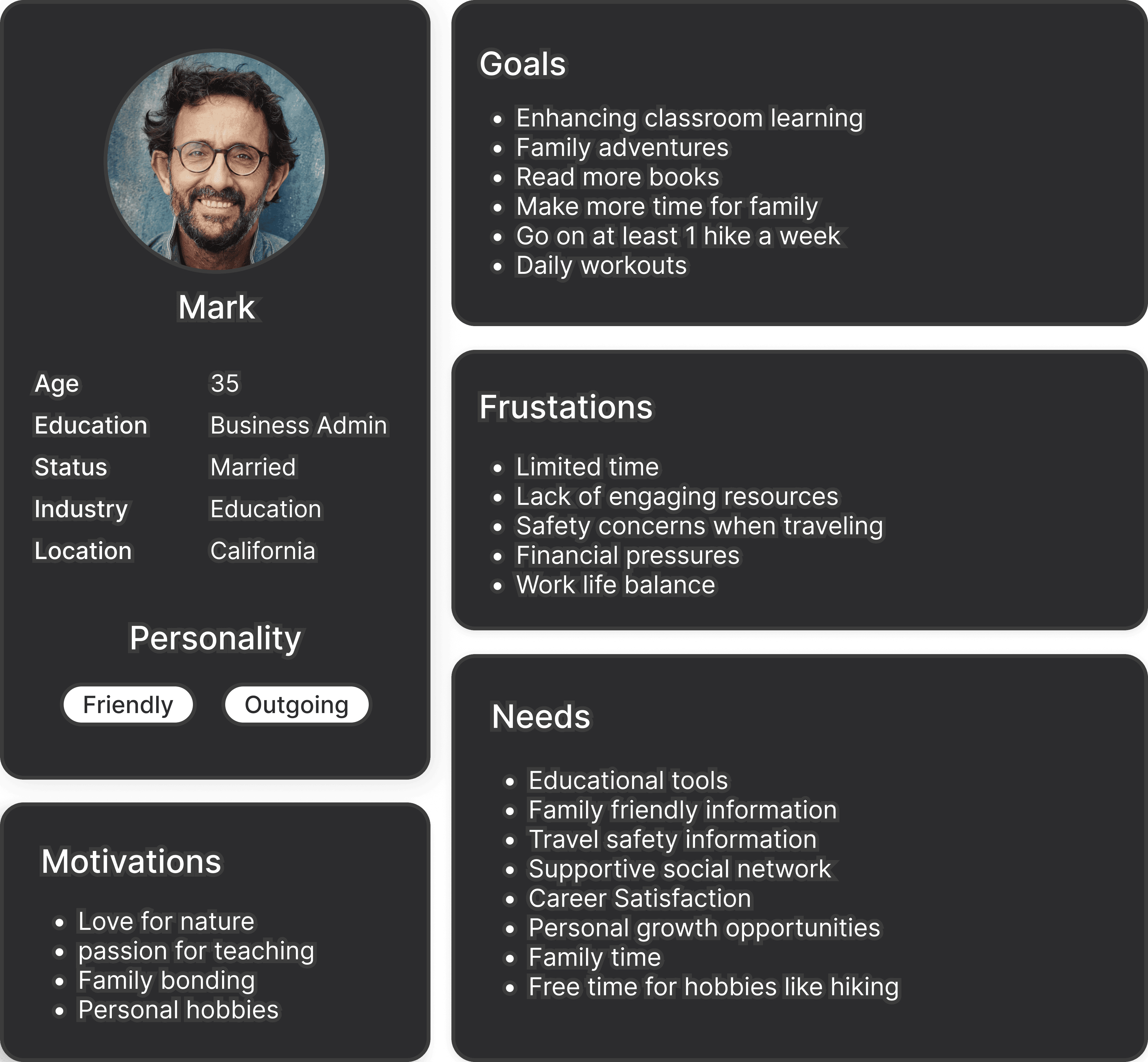To further refine the app's design, I created a user persona based on Mark, a 35-year-old outdoor enthusiast and educator, who represents a broad range of target users. Mark is highly motivated by nature, family bonding, and personal growth, but he often faces frustrations such as limited time, safety concerns, and a lack of engaging resources. His needs include finding educational tools, family-friendly activities, and safety information while exploring nature.