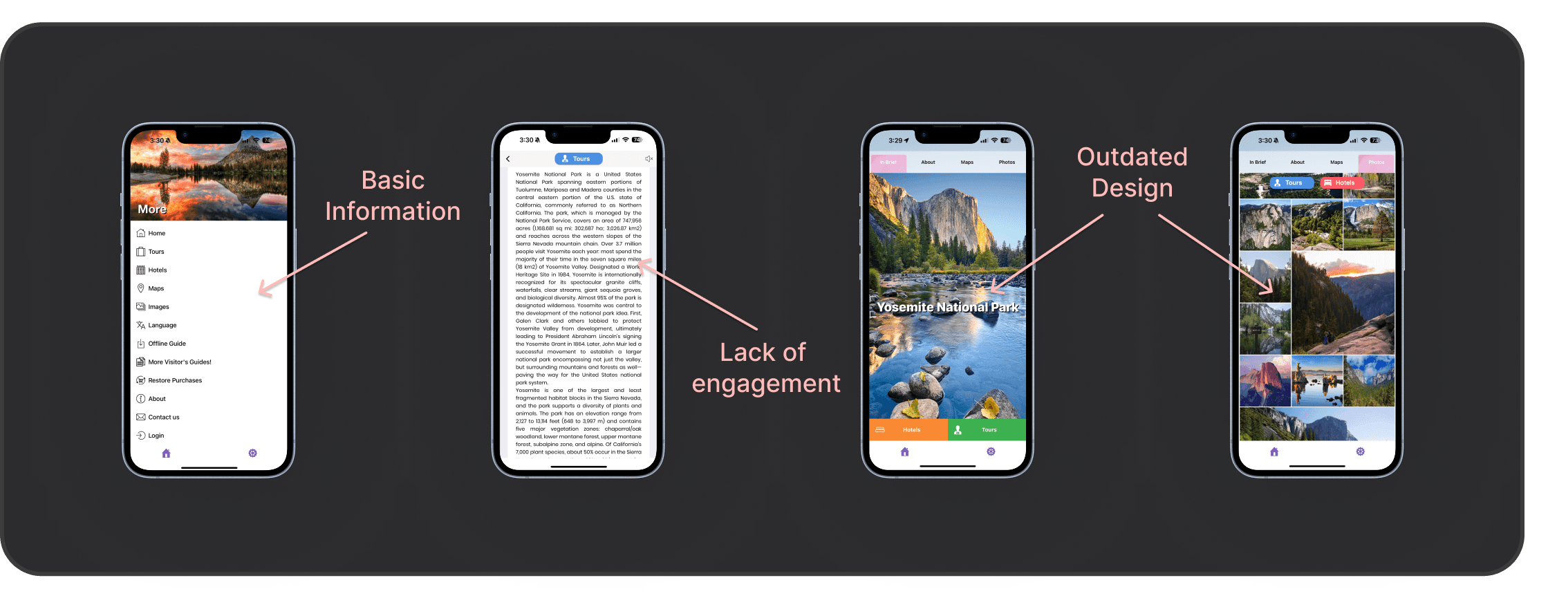 The research phase involved an extensive review of existing apps related to Yosemite and other national parks, as well as user feedback from platforms such as Reddit and app review sites. These reviews revealed that many users were dissatisfied with the current offerings, highlighting common complaints about the lack of interactivity, outdated information, and uninspiring user interfaces. Visitors expressed a desire for a more dynamic, engaging experience that went beyond just providing directions or static facts. Many mentioned they felt disconnected from the park while using these apps, which sparked the idea of using gamification to enhance engagement and make the experience more interactive.
