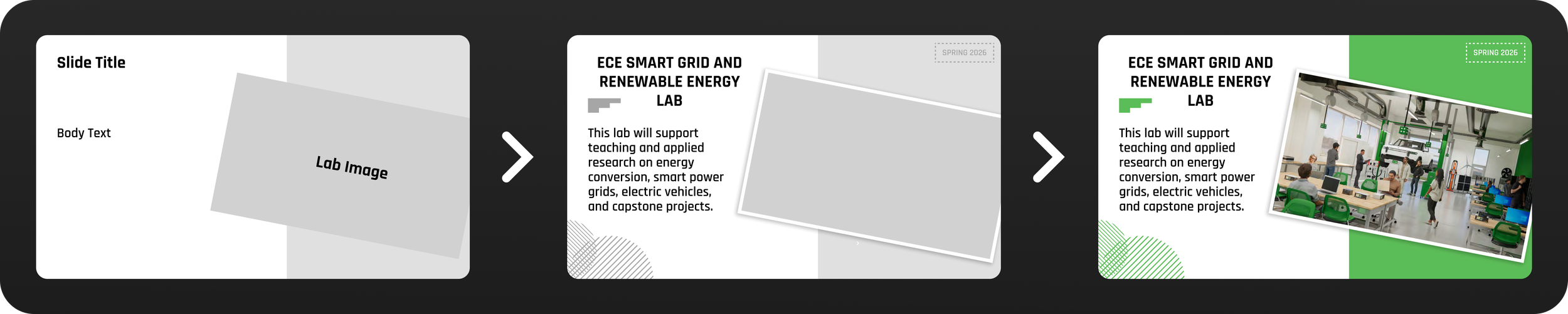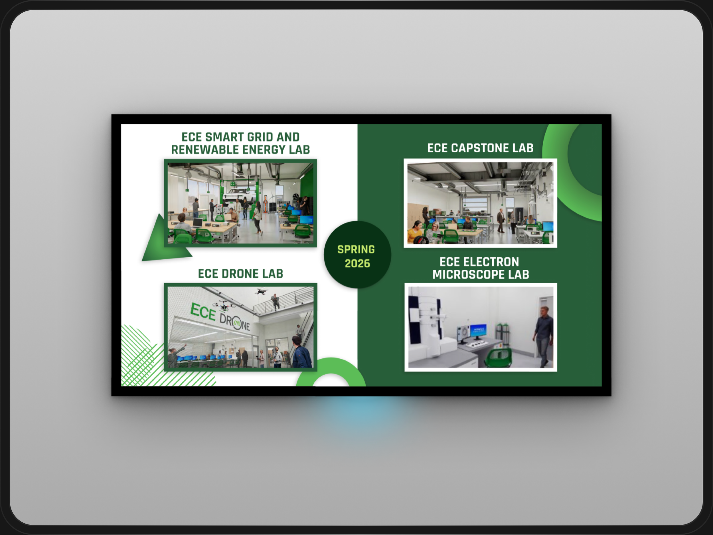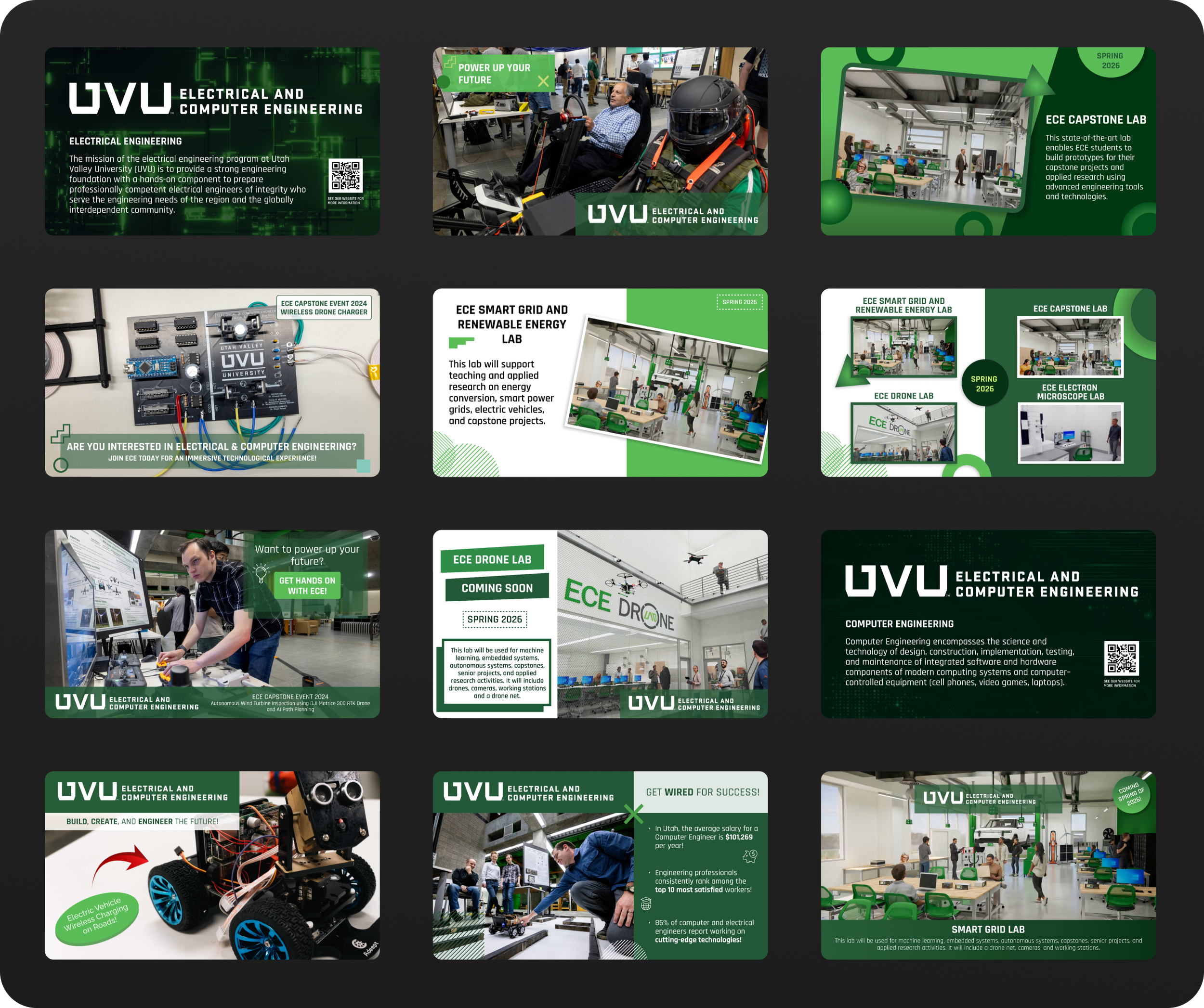 The final digital signage design combines clear, impactful messaging with visually engaging elements to attract prospective students to UVU’s Electrical and Computer Engineering department. We used a clean, modern layout that adhered to UVU’s design guidelines, ensuring consistency with the university’s branding. The animations were designed to grab attention without overwhelming the viewer, with key information like program highlights, lab features, and student projects prominently displayed. Each slide included a clear call to action, encouraging students to learn more about the program and engage with the ECE department. The end result was a polished, dynamic signage system that balanced both aesthetics and functionality, designed to spark curiosity and motivate undecided students to consider the ECE program.